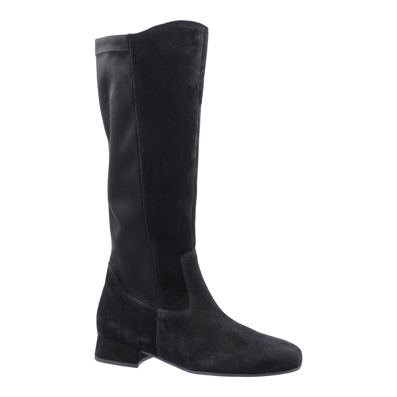 Black suede knee high boot with stretch back panel. Medium fitting leg.