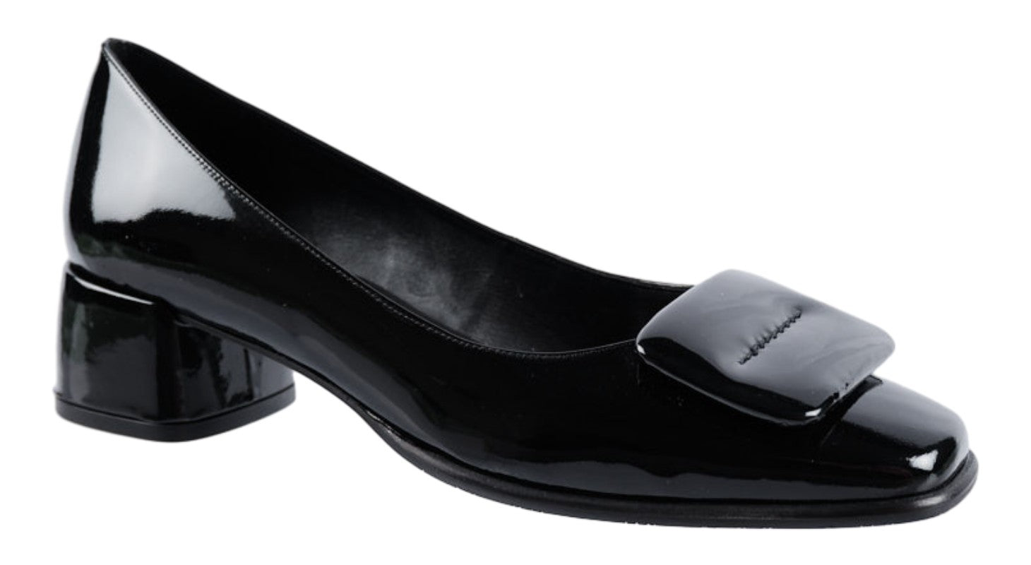 Black soft patent leather court shoe with patent trim. 35mm heel