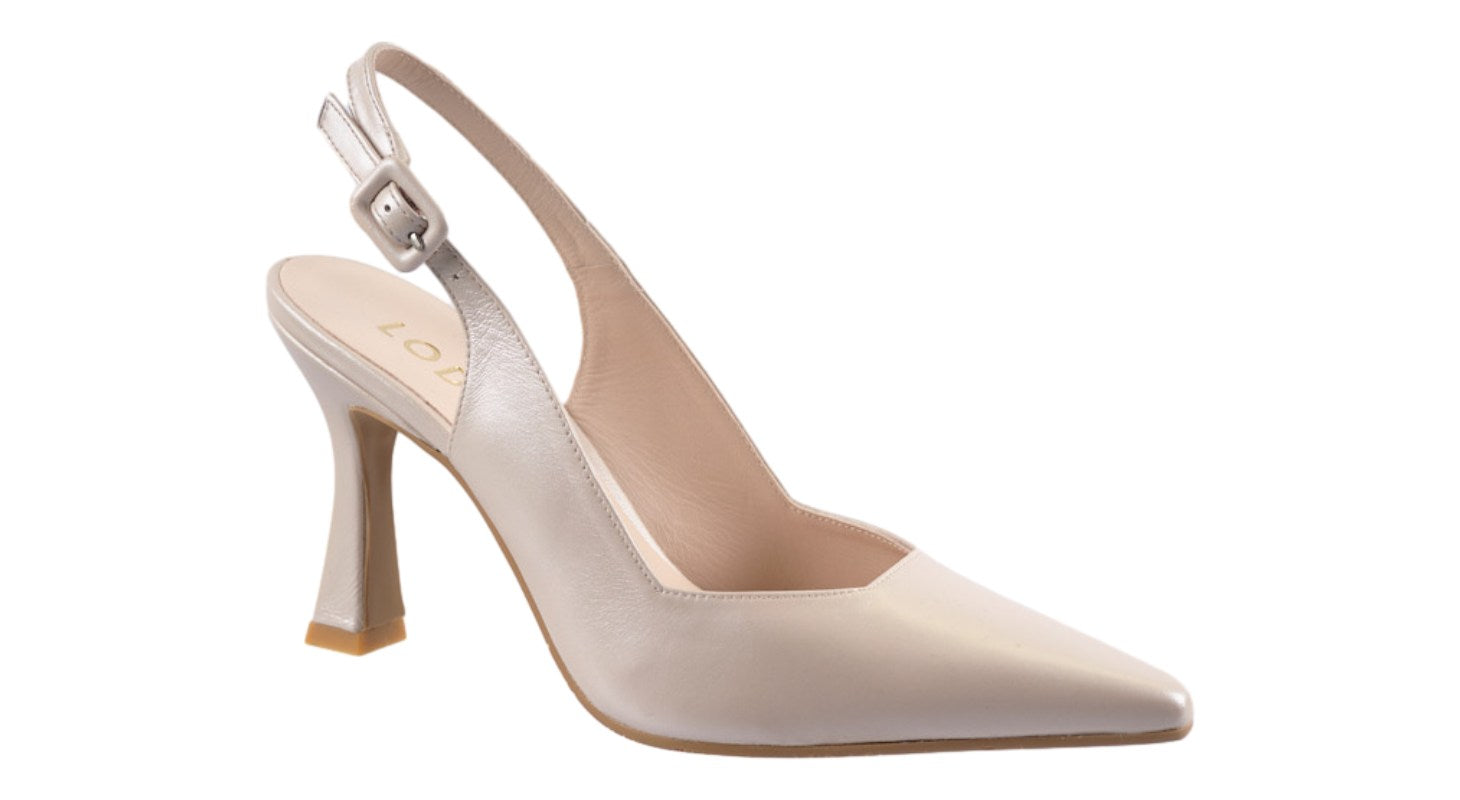 Pearlised nude adjustable strap slingback with a 90mm heel.