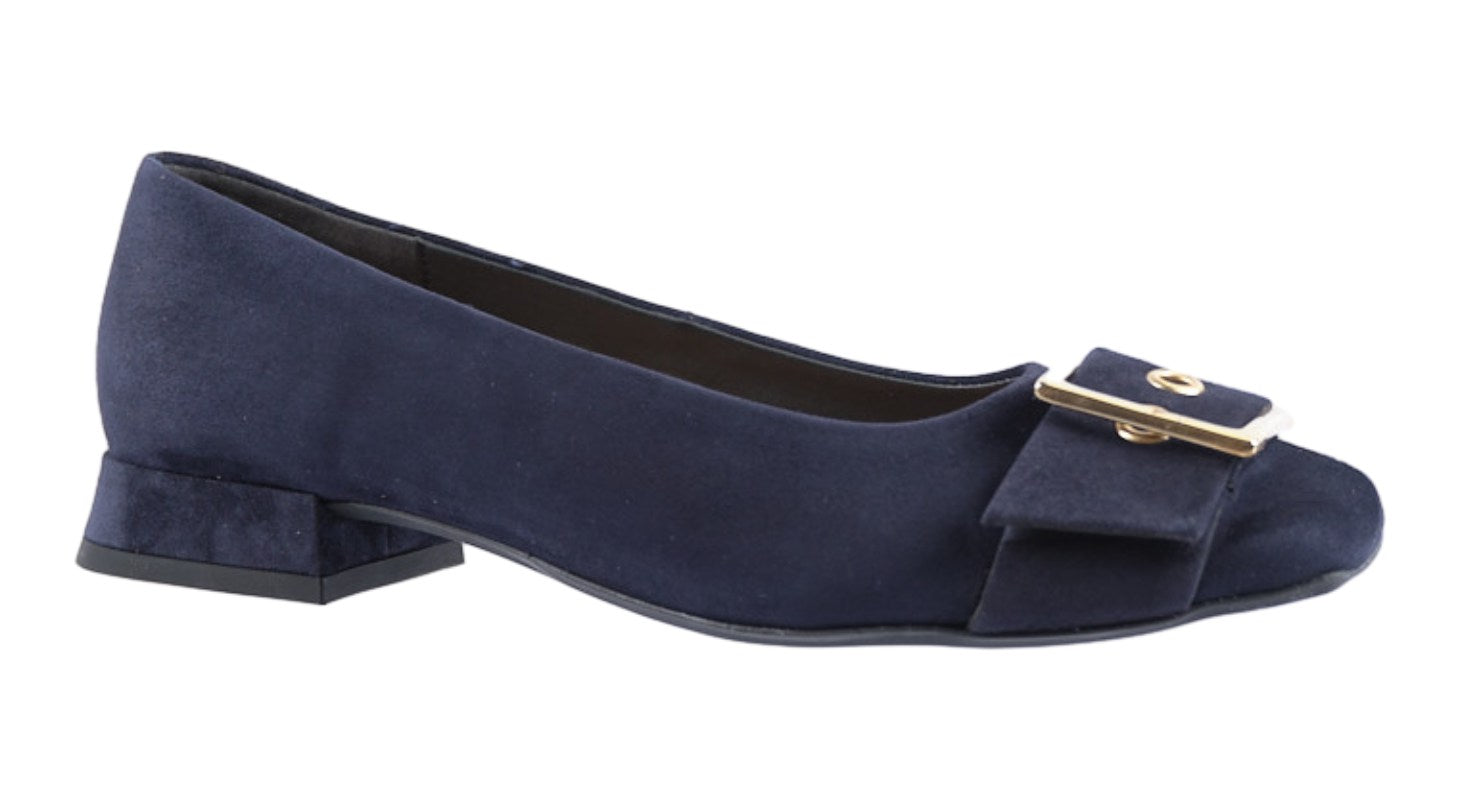 Navy suede low heeled court with gold buckle trim
